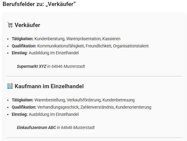Bei der Ausgabe der Berufsfelder werden in der fiktive Beispiele von Firmen und Orten ausgegeben, findet die KI dazu aktuell nichts werden „Muster Firmen“ und Orte genannt.