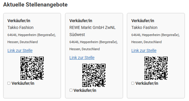 Sie können entweder die gesamte Seite drucken oder gezielt die drei ausgewählten Arbeits- bzw. Ausbildungsstellen in Tabellenform anzeigen lassen. Mit einem Klick auf „Stellen mit QR drucken“ wird diese Tabelle erstellt und für den Druck vorbereitet. Alternativ können Sie über den Button „E-Mail“ Ihr E-Mail-Programm öffnen – die ausgewählten Stellen sind dann bereits als Nachrichtentext in einer neuen E-Mail eingefügt.